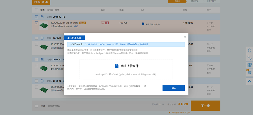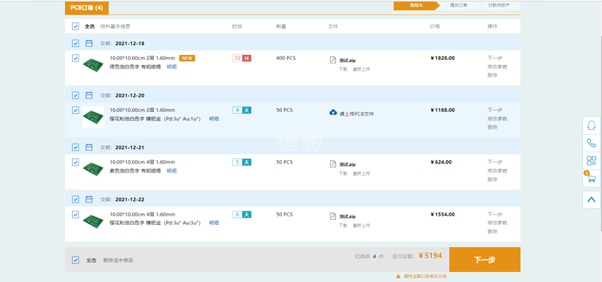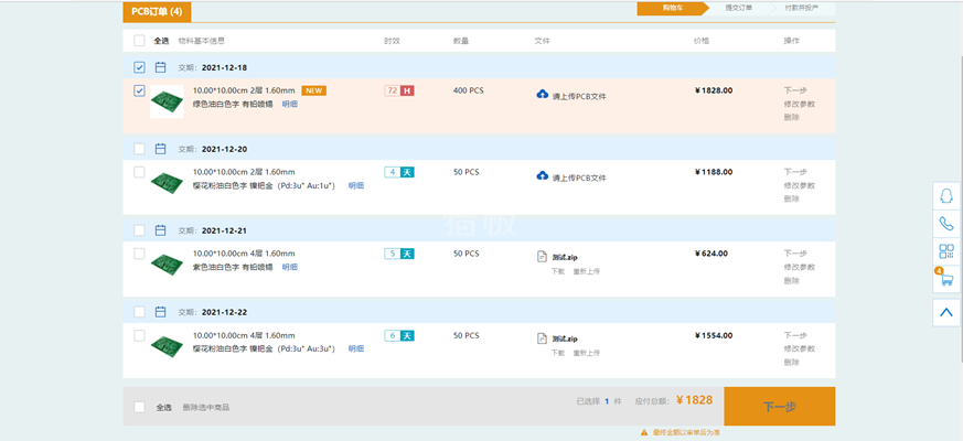 六、选择已添加PCB文件的订单进行结算(也可多条同时提交),点击下一步。