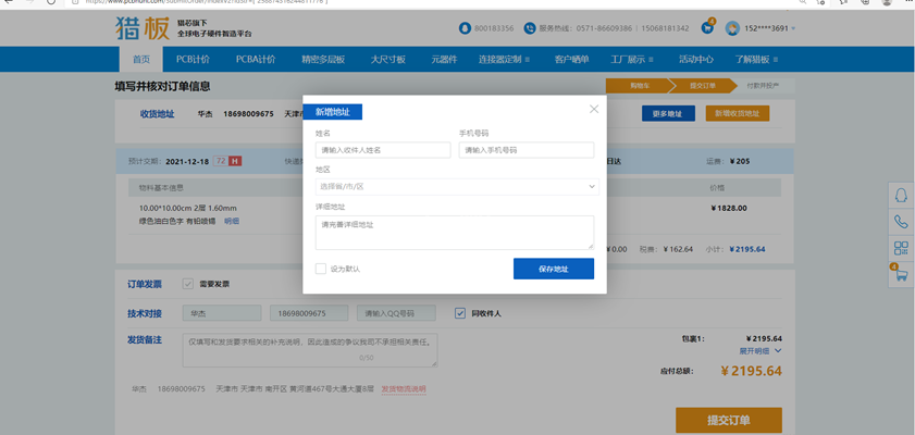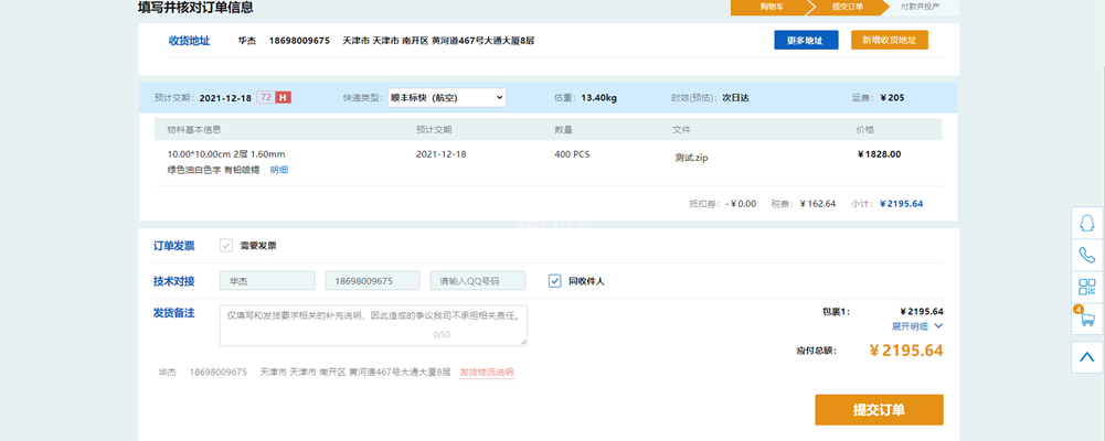 八、添加收货信息、选择订单联系人(审单或工程可能对您的文件有疑问需要确认)。确认订单信息,无误后提交订单。